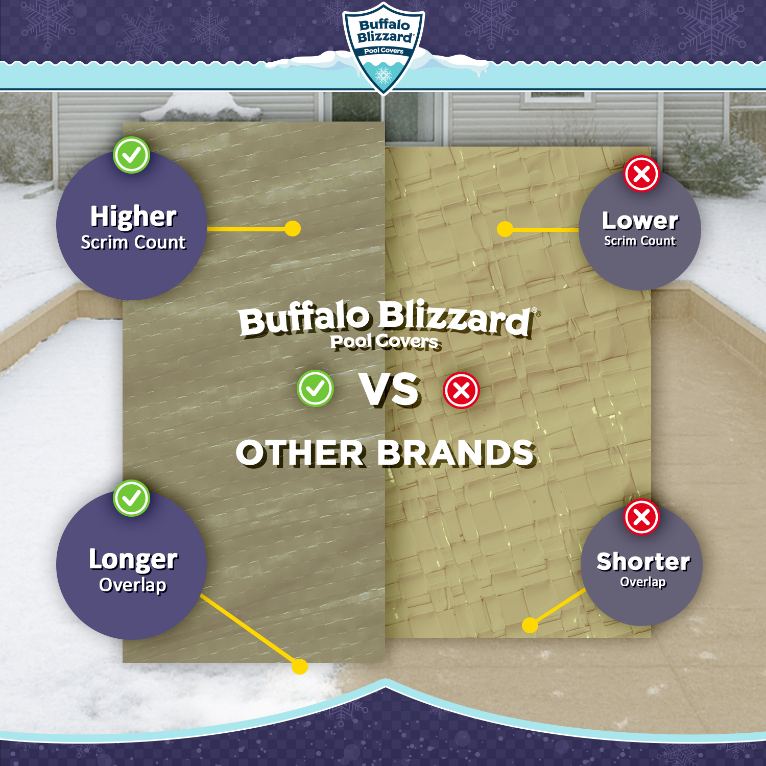 Made from a tough and durable polyethylene fabric, the Buffalo Blizzard® Supreme Plus cover is specially designed to protect your pool from snow, ice, and debris during the off-season. Each cover is constructed from a triple-laminated material that is resistant to cracking, splitting, and tearing from cold temperatures. With 12 x 12 Hold-Tite scrim per square inch, this cover was designed with durability in mind and features UV-resistant threads for added strength.